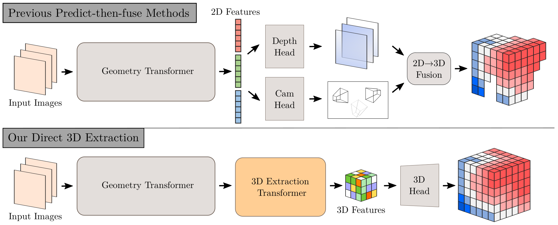 Common pipelines like VGGT [Wang, 2025] (top) route transformer features through per-view 2D decoder heads, discarding the joint multi-view representation before 3D assembly using e.g. TSDF fusion [Millane, 2024] or Poisson surface reconstruction [Kazhdan, 2006]. We instead extract dense 3D features directly from the transformer's intermediate feature space, preserving the full multi-view information.