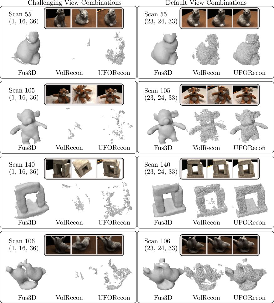 We compare to other generalizable distance field prediction methods, VolRecon [Ren 2023] and UFOrecon [Na 2024], on standard and challenging view sets (as proposed by UFOrecon).