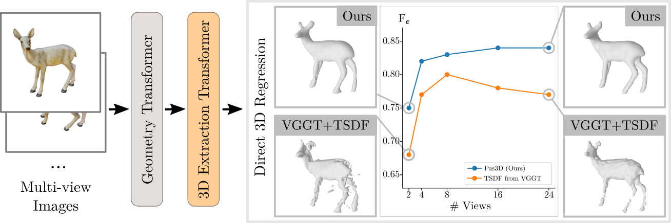 Fus3D directly regresses a 3D representation from the latent space of a multi-view geometry transformer, bypassing per-view prediction and post-hoc fusion. This, compared to VGGT [Wang, 2025] using TSDF fusion, yields improved surface completeness under sparse views (left, 2 views) and avoids error accumulation reducing details at scale (right, 24 views), also reflected in the F-score curves across view counts (center).